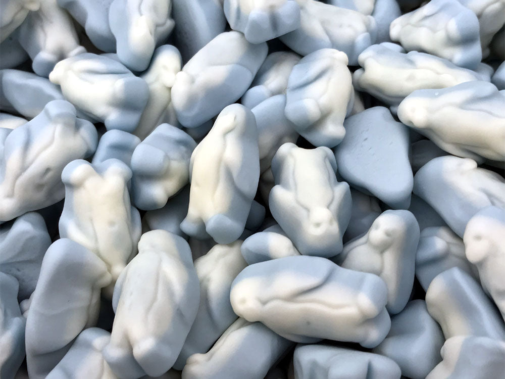 INGREDIENTS: Sugar, Glucose Syrup, Water, Pork Gelatine, Acids (Lactic Acid, Malic Acid, Citric Acid), Plant and Fruit Concentrates (Spirulina, Apple), Stabiliser (Glycerol), Flavouring, Vegetable Oil (Coconut), Glazing Agent (Carnauba Wax).